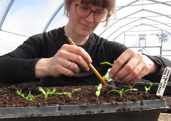 Charlotte potting up tomatoes / Charlotte repique les tomates