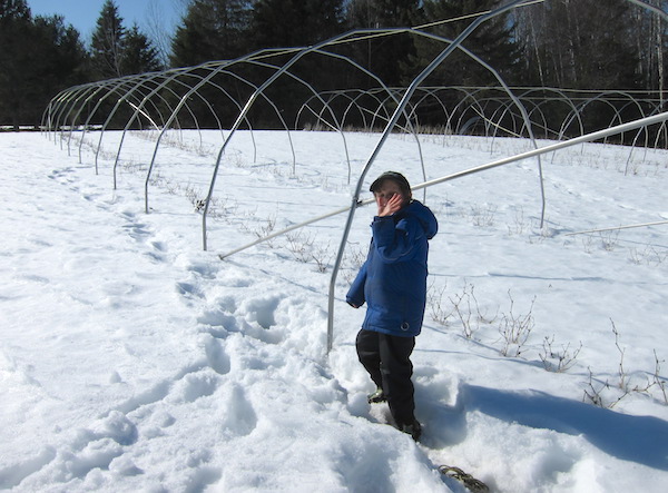 Emmett breaking up the crust over the greenhouse plastic / Emmett brise la neige autour des tunnels chenille