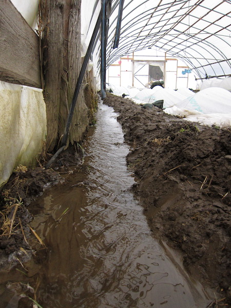 Spring runoff in the ditches we dug at the edges of our high tunnel. / Écoulement de printemps dans les fossés que nous avons creusé dans la serre non-chauffé.